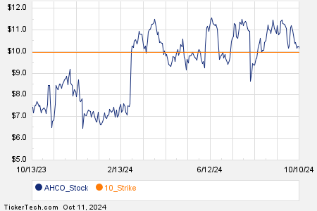 Examining AHCO’s trailing twelve-month trading history, the chart highlights the $10 strike, accentuated in a vivid orange hue. This surge in options trading activity indicates a potential shift in market sentiment towards AHCO.