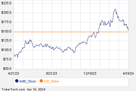 In today’s whirlwind of trading activities, Advanced Micro Devices Inc (AMD) grabbed the spotlight with a staggering 538,910 contracts exchanged, equivalent to 53.9 million underlying shares – a whopping 87.8% of AMD’s typical daily trading volume over the last month. Eyes were glued on the $150 strike put option expiring on April 19, 2024, as it played a lead role, boasting 52,885 contracts traded so far. This captivating performance represents approximately 5.3 million shares of AMD. The charts capturing AMD’s trail over the past year have been painted with the $150 strike, shining in a vivid orange hue.