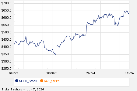 Diving into the realm of options trading among components of the Russell 3000 index, all eyes turn to Netflix Inc (NFLX) on a particularly notable trading day. A remarkable total volume of 60,510 contracts has already exchanged hands. This figure translates to roughly 6.1 million underlying shares, significantly surpassing NFLX’s average monthly trading volume of 3.0 million shares. The standout surge in trading activity centers around the $645 strike put option expiring on June 7, 2024. A staggering 2,869 contracts have been traded, representing approximately 286,900 underlying shares of NFLX. The robust trading history for NFLX over the last twelve months highlights the $645 strike option in a striking shade of orange.