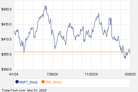Looking at options trading activity among components of the Russell 3000 index, there is noteworthy activity today in Microsoft Corporation (Symbol: MSFT), where a total volume of 247,107 contracts has been traded thus far today, a contract volume which is representative of approximately 24.7 million underlying shares (given that every 1 contract represents 100 underlying shares). That number works out to 108.2% of MSFT’s average daily trading volume over the past month, of 22.8 million shares. Particularly high volume was seen for the $390 strike call option expiring April 04, 2025, with 8,892 contracts trading so far today, representing approximately 889,200 underlying shares of MSFT. Below is a chart showing MSFT’s trailing twelve month trading history, with the $390 strike highlighted in orange: