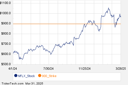 Among the underlying components of the Russell 3000 index, we saw noteworthy options trading volume today in Netflix Inc (Symbol: NFLX), where a total of 71,373 contracts have traded so far, representing approximately 7.1 million underlying shares. That amounts to about 130.7% of NFLX’s average daily trading volume over the past month of 5.5 million shares. Especially high volume was seen for the $900 strike put option expiring April 04, 2025, with 1,615 contracts trading so far today, representing approximately 161,500 underlying shares of NFLX. Below is a chart showing NFLX’s trailing twelve month trading history, with the $900 strike highlighted in orange: