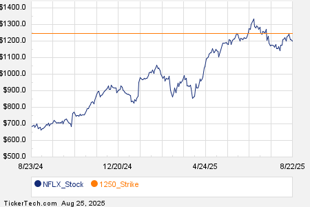 Looking at options trading activity among components of the S&P 500 index, there is noteworthy activity today in Netflix Inc (Symbol: NFLX), where a total volume of 87,253 contracts has been traded thus far today, a contract volume which is representative of approximately 8.7 million underlying shares (given that every 1 contract represents 100 underlying shares). That number works out to 295.6% of NFLX’s average daily trading volume over the past month, of 3.0 million shares. Especially high volume was seen for the $1250 strike call option expiring August 29, 2025, with 5,604 contracts trading so far today, representing approximately 560,400 underlying shares of NFLX. Below is a chart showing NFLX’s trailing twelve month trading history, with the $1250 strike highlighted in orange: