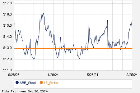 Notably, the $13 strike put option expiring on October 18, 2024, saw substantial interest with 16,466 contracts traded, representing about 1.6 million underlying shares of ABR. The options arena for ABR paints a vivid picture with the $13 strike proudly highlighted in an orange hue on the trading history chart.