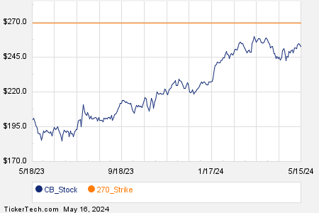 Looking at options trading activity today in Chubb Ltd (Symbol: CB), a total volume of 19,881 contracts has been traded so far. This volume equates to about 2.0 million underlying shares, indicating a striking 127.8% of CB’s typical daily trading volume over the past month. Of particular interest was the $270 strike call option expiring on May 17, 2024, with 2,496 contracts traded, representing approximately 249,600 underlying shares of CB. Inspecting CB’s trailing twelve-month trading history, the $270 strike is highlighted in a vivid orange hue.