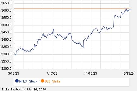 Stumbling across the financial landscape on Thursday, Netflix Inc (Symbol: NFLX) stood out like a glitzy Hollywood star, attracting significant attention with around 89,953 contracts trading hands. This volume reflects a whopping 9.0 million underlying shares, a dramatic surge equivalent to approximately 271% of NFLX’s daily average activity over the past month. The clamoring crowd gathered most fervently around the $620 strike call option expiring on March 15, 2024. A dazzling 9,777 contracts were exchanged, representing close to 977,700 NFLX shares. The charts visually narrate NFLX’s trading saga, with the $620 strike painted vividly in orange hues.
