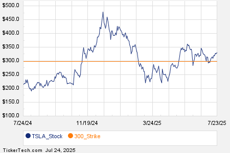 Among the underlying components of the S&P 500 index, we saw noteworthy options trading volume today in Tesla Inc (Symbol: TSLA), where a total of 2.5 million contracts have traded so far, representing approximately 249.0 million underlying shares. That amounts to about 270.2% of TSLA’s average daily trading volume over the past month of 92.2 million shares. Especially high volume was seen for the $300 strike put option expiring July 25, 2025, with 157,966 contracts trading so far today, representing approximately 15.8 million underlying shares of TSLA. Below is a chart showing TSLA’s trailing twelve month trading history, with the $300 strike highlighted in orange: