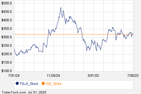 Looking at options trading activity among components of the Russell 3000 index, there is noteworthy activity today in Tesla Inc (Symbol: TSLA), where a total volume of 1.8 million contracts has been traded thus far today, a contract volume which is representative of approximately 175.8 million underlying shares (given that every 1 contract represents 100 underlying shares). That number works out to 182.5% of TSLA’s average daily trading volume over the past month, of 96.3 million shares. Particularly high volume was seen for the $320 strike call option expiring August 01, 2025, with 121,541 contracts trading so far today, representing approximately 12.2 million underlying shares of TSLA. Below is a chart showing TSLA’s trailing twelve month trading history, with the $320 strike highlighted in orange: