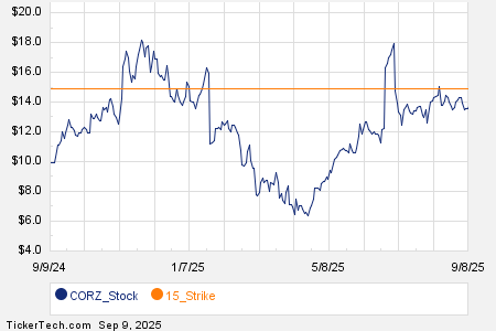 Looking at options trading activity among components of the Russell 3000 index, there is noteworthy activity today in Core Scientific Inc (Symbol: CORZ), where a total volume of 316,317 contracts has been traded thus far today, a contract volume which is representative of approximately 31.6 million underlying shares (given that every 1 contract represents 100 underlying shares). That number works out to 199.9% of CORZ’s average daily trading volume over the past month, of 15.8 million shares. Especially high volume was seen for the $15 strike call option expiring September 19, 2025, with 105,676 contracts trading so far today, representing approximately 10.6 million underlying shares of CORZ. Below is a chart showing CORZ’s trailing twelve month trading history, with the $15 strike highlighted in orange: