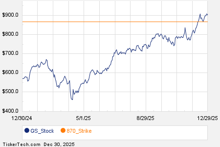 Looking at options trading activity among components of the S&P 500 index, there is noteworthy activity today in Goldman Sachs Group Inc (Symbol: GS), where a total volume of 14,804 contracts has been traded thus far today, a contract volume which is representative of approximately 1.5 million underlying shares (given that every 1 contract represents 100 underlying shares). That number works out to 70.1% of GS’s average daily trading volume over the past month, of 2.1 million shares. Particularly high volume was seen for the $870 strike put option expiring January 02, 2026, with 513 contracts trading so far today, representing approximately 51,300 underlying shares of GS. Below is a chart showing GS’s trailing twelve month trading history, with the $870 strike highlighted in orange:
