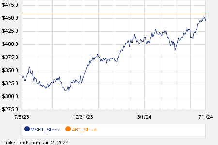 Zooming into specifics, the $460 strike call option due July 05, 2024, has truly stolen the limelight with 21,597 contracts traded, representing roughly 2.2 million underlying shares of MSFT. If numbers could sing, today’s trade would be a chorus of crescendos. Visual learners feast on the below chart detailing MSFT’s market movements, with the $460 strike shining bright in orange hues.