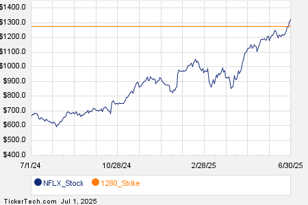 Among the underlying components of the Russell 3000 index, we saw noteworthy options trading volume today in Netflix Inc (Symbol: NFLX), where a total of 150,814 contracts have traded so far, representing approximately 15.1 million underlying shares. That amounts to about 548.5% of NFLX’s average daily trading volume over the past month of 2.7 million shares. Particularly high volume was seen for the $1280 strike put option expiring July 03, 2025, with 5,588 contracts trading so far today, representing approximately 558,800 underlying shares of NFLX. Below is a chart showing NFLX’s trailing twelve month trading history, with the $1280 strike highlighted in orange: