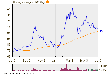 In trading on Thursday, shares of Alibaba Group Holding Ltd (Symbol: BABA) crossed below their 200 day moving average of $108.22, changing hands as low as $107.95 per share. Alibaba Group Holding Ltd shares are currently trading off about 2% on the day. The chart below shows the one year performance of BABA shares, versus its 200 day moving average: