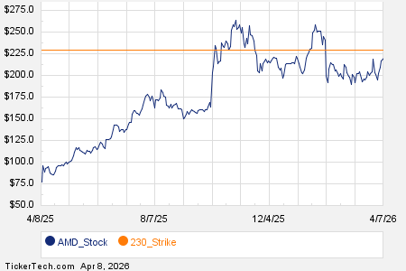 Among the underlying components of the Russell 3000 index, we saw noteworthy options trading volume today in Advanced Micro Devices Inc (Symbol: AMD), where a total of 475,354 contracts have traded so far, representing approximately 47.5 million underlying shares. That amounts to about 143% of AMD’s average daily trading volume over the past month of 33.2 million shares. Particularly high volume was seen for the $230 strike call option expiring April 10, 2026, with 20,135 contracts trading so far today, representing approximately 2.0 million underlying shares of AMD. Below is a chart showing AMD’s trailing twelve month trading history, with the $230 strike highlighted in orange: