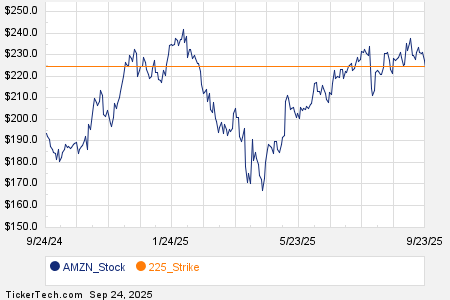 Among the underlying components of the Russell 3000 index, we saw noteworthy options trading volume today in Amazon.com Inc (Symbol: AMZN), where a total of 717,835 contracts have traded so far, representing approximately 71.8 million underlying shares. That amounts to about 171.7% of AMZN’s average daily trading volume over the past month of 41.8 million shares. Particularly high volume was seen for the $225 strike call option expiring September 26, 2025, with 44,151 contracts trading so far today, representing approximately 4.4 million underlying shares of AMZN. Below is a chart showing AMZN’s trailing twelve month trading history, with the $225 strike highlighted in orange: