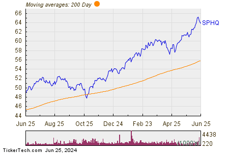 The chart unveils the year-long performance of SPHQ, juxtaposed against its 200-day moving average—a visual symphony capturing the rhythm of market dynamics. Despite periodic fluctuations, SPHQ boasts a 52-week trading range stretching from a modest $47.72 per share to a peak of $65.5692. The recent trading price of $64.03 stands as a testament to the ETF’s buoyancy amidst market undulations.