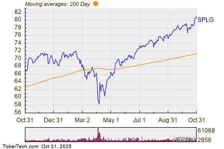 The chart below shows the one year price performance of SPLG, versus its 200 day moving average: