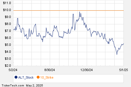 Among the underlying components of the Russell 3000 index, we saw noteworthy options trading volume today in Altimmune Inc (Symbol: ALT), where a total of 15,292 contracts have traded so far, representing approximately 1.5 million underlying shares. That amounts to about 74.3% of ALT’s average daily trading volume over the past month of 2.1 million shares. Especially high volume was seen for the $10 strike call option expiring June 20, 2025, with 2,588 contracts trading so far today, representing approximately 258,800 underlying shares of ALT. Below is a chart showing ALT’s trailing twelve month trading history, with the $10 strike highlighted in orange:
