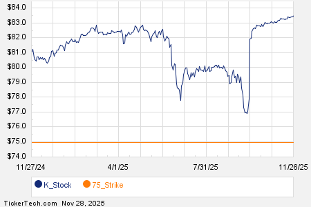 Among the underlying components of the S&P 500 index, we saw noteworthy options trading volume today in Kellanova (Symbol: K), where a total of 17,570 contracts have traded so far, representing approximately 1.8 million underlying shares. That amounts to about 72.6% of K’s average daily trading volume over the past month of 2.4 million shares. Especially high volume was seen for the $75 strike call option expiring January 16, 2026, with 7,280 contracts trading so far today, representing approximately 728,000 underlying shares of K. Below is a chart showing K’s trailing twelve month trading history, with the $75 strike highlighted in orange: