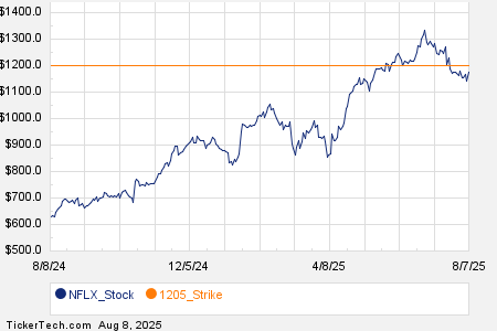 Among the underlying components of the S&P 500 index, we saw noteworthy options trading volume today in Netflix Inc (Symbol: NFLX), where a total of 134,017 contracts have traded so far, representing approximately 13.4 million underlying shares. That amounts to about 338.3% of NFLX’s average daily trading volume over the past month of 4.0 million shares. Particularly high volume was seen for the $1205 strike call option expiring August 08, 2025, with 8,043 contracts trading so far today, representing approximately 804,300 underlying shares of NFLX. Below is a chart showing NFLX’s trailing twelve month trading history, with the $1205 strike highlighted in orange: