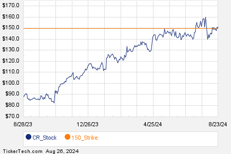 Among the plethora of options, the $150 strike call option expiring on September 20, 2024, stood out with 1,115 contracts traded, representing around 111,500 underlying shares of CR. This anomaly was captured vividly in CR’s trading history chart, with the $150 strike shining brightly in orange hues.