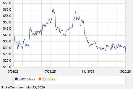 Among the underlying components of the S&P 500 index, we saw noteworthy options trading volume today in Super Micro Computer Inc (Symbol: SMCI), where a total of 429,969 contracts have traded so far, representing approximately 43.0 million underlying shares. That amounts to about 121.5% of SMCI’s average daily trading volume over the past month of 35.4 million shares. Particularly high volume was seen for the $20 strike put option expiring March 27, 2026, with 20,725 contracts trading so far today, representing approximately 2.1 million underlying shares of SMCI. Below is a chart showing SMCI’s trailing twelve month trading history, with the $20 strike highlighted in orange: