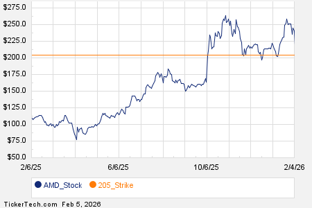 Looking at options trading activity among components of the Russell 3000 index, there is noteworthy activity today in Advanced Micro Devices Inc (Symbol: AMD), where a total volume of 809,417 contracts has been traded thus far today, a contract volume which is representative of approximately 80.9 million underlying shares (given that every 1 contract represents 100 underlying shares). That number works out to 191.1% of AMD’s average daily trading volume over the past month, of 42.4 million shares. Especially high volume was seen for the $205 strike call option expiring February 06, 2026, with 28,029 contracts trading so far today, representing approximately 2.8 million underlying shares of AMD. Below is a chart showing AMD’s trailing twelve month trading history, with the $205 strike highlighted in orange: