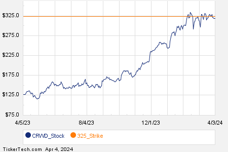 Today, the options market witnessed a flurry of activity in CrowdStrike Holdings Inc (Symbol: CRWD), with a total of 18,886 contracts traded so far. This volume represents approximately 1.9 million underlying shares, a substantial 44% of CRWD’s average daily trading volume over the past month. Of particular interest was the $325 strike call option expiring on April 05, 2024, with 894 contracts changing hands today, equivalent to around 89,400 underlying shares. This surge in activity has propelled CRWD into the spotlight, with investors closely monitoring the stock’s movement.