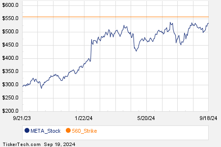 The S&P 500 index revealed a flurry of options trading activity today, with Meta Platforms Inc (META) at the helm. A staggering 391,481 contracts have been exchanged to date, representing a hefty 39.1 million underlying shares. This surge accounts for a whopping 368.2% of META’s average daily trading volume over the past month – a vivid illustration of the market’s fervor surrounding META. Of particular interest was the $560 strike call option set to expire on September 20, 2024, which saw 18,879 contracts changing hands today, equating to approximately 1.9 million underlying shares of META. This frenetic activity was captured in a vibrant chart depicting META’s trading history.