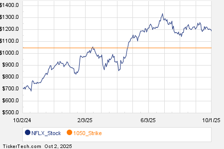 Looking at options trading activity among components of the S&P 500 index, there is noteworthy activity today in Netflix Inc (Symbol: NFLX), where a total volume of 170,930 contracts has been traded thus far today, a contract volume which is representative of approximately 17.1 million underlying shares (given that every 1 contract represents 100 underlying shares). That number works out to 557.4% of NFLX’s average daily trading volume over the past month, of 3.1 million shares. Especially high volume was seen for the $1050 strike put option expiring October 10, 2025, with 7,236 contracts trading so far today, representing approximately 723,600 underlying shares of NFLX. Below is a chart showing NFLX’s trailing twelve month trading history, with the $1050 strike highlighted in orange: