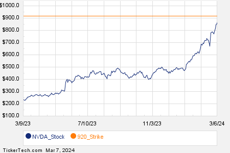 The trading floors of Wall Street witnessed a storm as NVIDIA Corp’s (NVDA) options market roared into action. A staggering 1.4 million contracts exchanging hands today, embodying a mammoth 137.9 million underlying shares – a phenomenon riveting investors akin to a fireworks display on the Fourth of July. This soaring activity eclipses NVDA’s usual monthly trading, hitting a vigorous 249.3%. The zenith of this maelstrom was the $920 strike call option expiring on March 8, 2024. A jaw-dropping 53,667 contracts danced through the market, symbolizing around 5.4 million shares of NVDA. Such fervor painted NVDA’s trading history in bold hues, with the oranges of the $920 strike illuminating the path to potential riches.