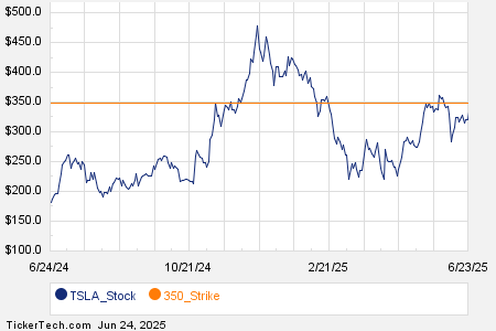 Among the underlying components of the S&P 500 index, we saw noteworthy options trading volume today in Tesla Inc (Symbol: TSLA), where a total of 1.4 million contracts have traded so far, representing approximately 138.4 million underlying shares. That amounts to about 112.6% of TSLA’s average daily trading volume over the past month of 123.0 million shares. Especially high volume was seen for the $350 strike call option expiring June 27, 2025, with 80,883 contracts trading so far today, representing approximately 8.1 million underlying shares of TSLA. Below is a chart showing TSLA’s trailing twelve month trading history, with the $350 strike highlighted in orange: