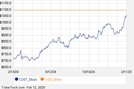 Looking at options trading activity among components of the Russell 3000 index, there is noteworthy activity today in Costco Wholesale Corp (Symbol: COST), where a total volume of 33,753 contracts has been traded thus far today, a contract volume which is representative of approximately 3.4 million underlying shares (given that every 1 contract represents 100 underlying shares). That number works out to 171.4% of COST’s average daily trading volume over the past month, of 2.0 million shares. Particularly high volume was seen for the $1100 strike call option expiring February 14, 2025, with 9,001 contracts trading so far today, representing approximately 900,100 underlying shares of COST. Below is a chart showing COST’s trailing twelve month trading history, with the $1100 strike highlighted in orange: