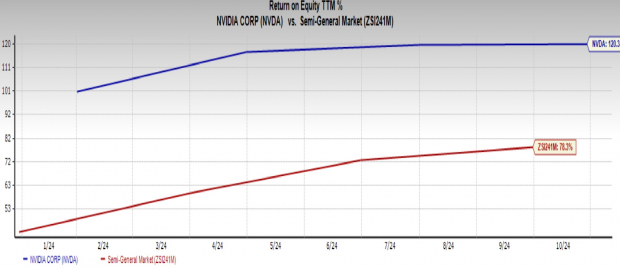 NVIDIA’s ROE at 120.4% exceeds the Semiconductor – General industry average of 78.3%, reflecting that its net income surpasses its equity.