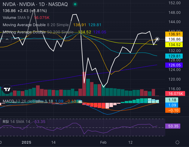 NVDA stock has cooled off year-to-date, down 2.83%, despite a stellar 69.93% gain over the past year. The stock is struggling near its 50-day moving average, a key technical level that often signals whether bullish momentum can continue or falter.