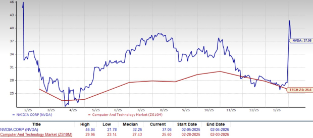 Compared to other semiconductor peers, NVIDIA has a higher P/E multiple than Advanced Micro Devices, Inc. AMD, Broadcom Inc. AVGO and Marvell Technology, Inc. MRVL. Currently, Advanced Micro Devices, Broadcom and Marvell Technology trade at P/E multiples of 36.39, 28.94 and 26.50, respectively.