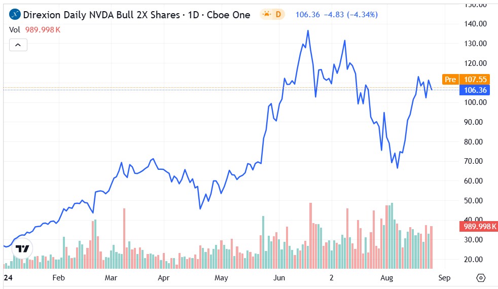 On the contrary, NVDD has dropped 68% this year, failing to hold support levels as NVDA stock rose. The fund’s bearish stance may attract more attention with rising trading volumes, especially if NVDA’s earnings disappoint.
