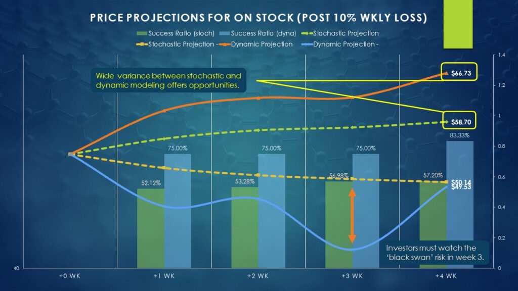 The end of the fourth week aligns with the options chain expiring Feb. 7. By then, ON stock may reach $58.70 (using stochastic modeling), up to a peak value of $66.73 (using dynamic modeling). Even if traders opted to meet roughly in the middle with a short strike price of $62, the payouts are still generous, again, because the market makers are not expecting such a robust move.
