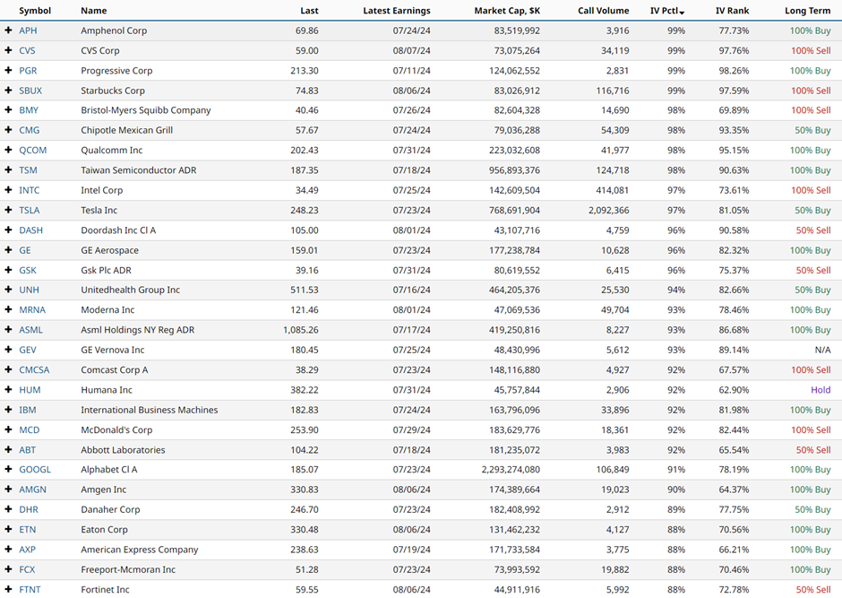 Investors seeking stocks with elevated implied volatility can utilize screening tools like Barchart’s Stock Screener. Setting filters for total call volume, market capitalization, and IV percentile enables traders to identify stocks with significant implied volatility levels, aiding in decision-making.