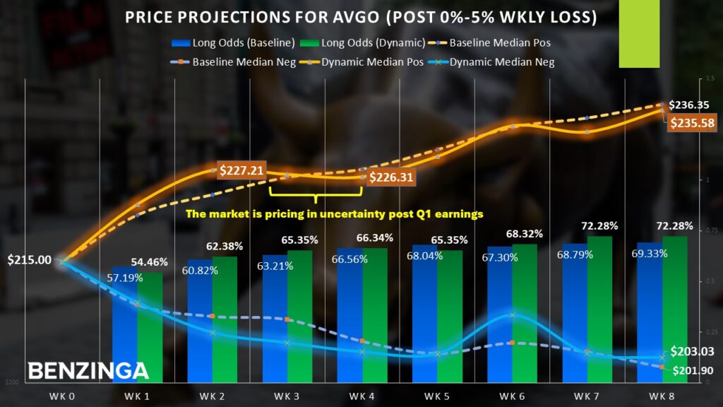 Nevertheless, based on past data, the dynamic long odds (accounting for data within specific parameters) from the second week onward tend to rise above the baseline probability. Stated differently, investors eventually buy the discount in AVGO stock.