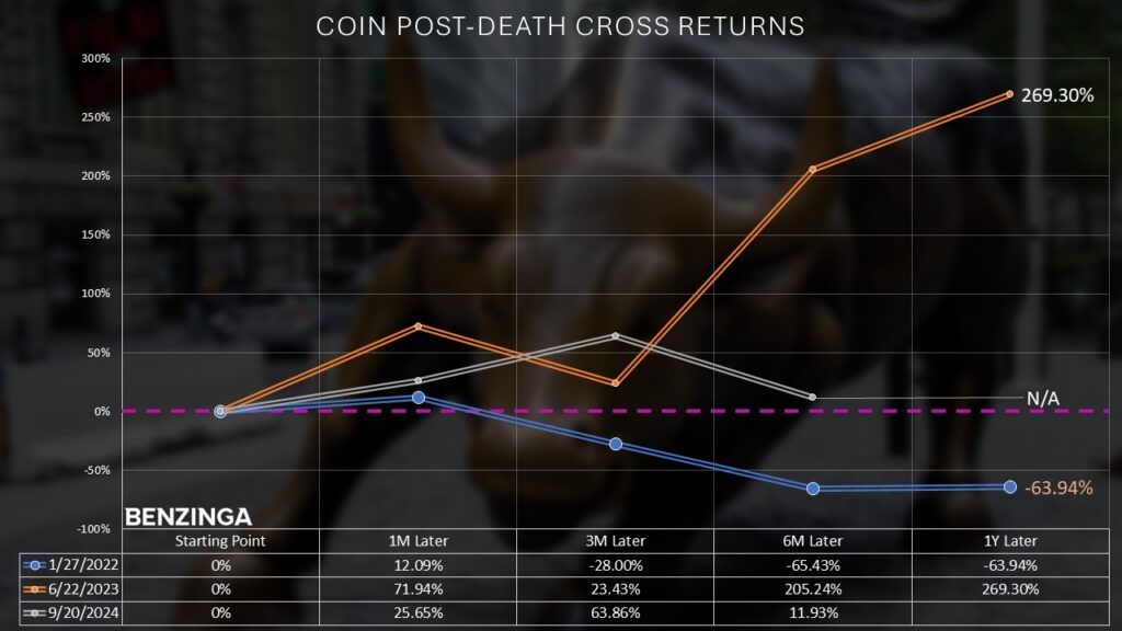 - On Sept. 9, 2024, Coinbase last signaled the death cross at a closing price of $170.09.