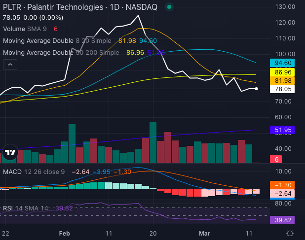 PLTR stock, at $78.05, is trading below its five, 20 and 50-day exponential moving averages, signaling continued selling pressure. The eight-day simple moving average (SMA) at $81.98, 20-day SMA at $94.60 and 50-day SMA at $86.96 all suggest the stock is still in bearish territory.