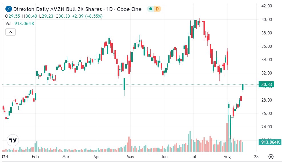 AMZU‘s post-Q2 earnings decline saw a significant recovery post-retail sales surge. The ETF broke its 20-day EMA and eyes the 200-day moving average, with $32 as a critical support level.