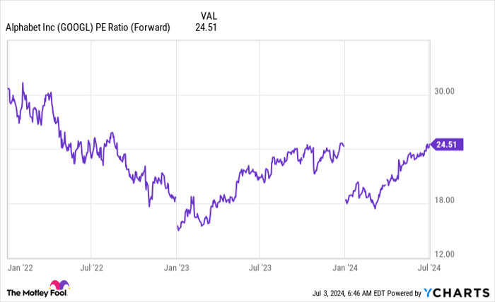 Currently, Alphabet trades at 24.5 times forward earnings. While this is still more expensive than the broader market’s 22.3 times forward earnings (measured by the S&P 500 index), it’s still far cheaper than the three larger companies in front of it.