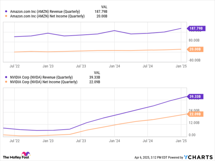 If you look at the revenue and profit trends above, you might be questioning why Amazon is making these investments in the first place. Well, just check out the disparity between Nvidia’s growth and Amazon’s. It’s clear that the slopes of Nvidia’s revenue and profit lines are far steeper than Amazon’s.