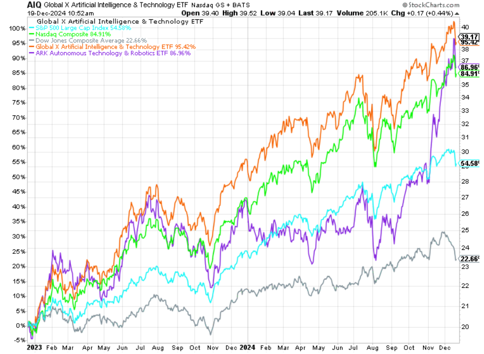 Exchange-traded funds – such as the Global X Artificial Intelligence & Technology ETF (AIQ) and the ARK Autonomous Technology & Robotics ETF (ARKQ) – represent strong proxies for the industry as a whole. And as you can see in the graph below, those AI plays have been killing it.