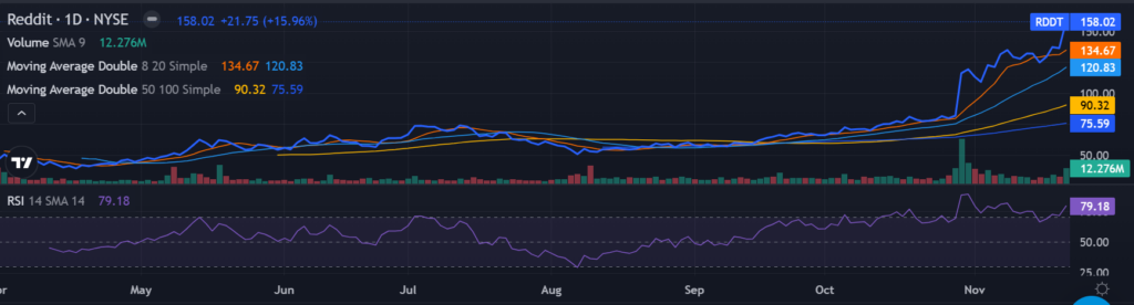 Shares of Reddit Inc RDDT nosedived by 6.2% to $148.11 per share in premarket, despite closing 16% higher at $158.02 apiece on Thursday. Technical analysis points towards a bullish trend, with the stock trading at overbought levels.