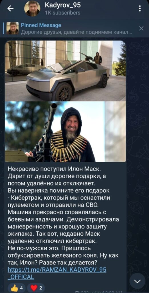 Ramzan Kadyrov, the Chechen leader, made a startling claim on Friday implicating Tesla’s enigmatic CEO, Elon Musk. Kadyrov alleged that Musk remotely deactivated his prized Cybertruck, equipped with a mounted machine gun, as it was deployed to the Northern Military District amidst the Russia-Ukraine conflict.