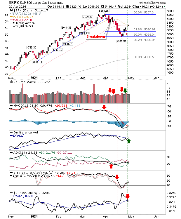 Today might see a tilt towards selling pressure. However, a stable or marginally lower close could instigate optimism for breaching the overhead 50-day MAs, setting the stage for challenging the March highs. Only time will reveal the unfolding patterns and challenges that lie ahead.