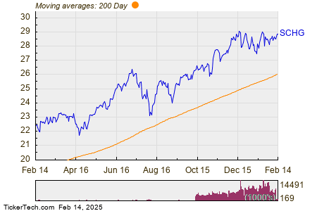 The chart below shows the one year price performance of SCHG, versus its 200 day moving average: