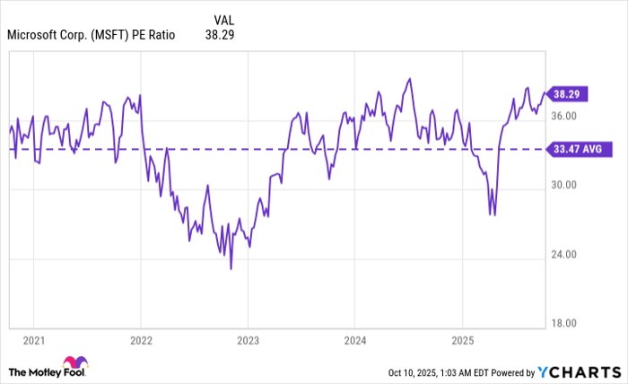 Microsoft stock isn’t cheap right now. It’s trading at a price-to-earnings (P/E) ratio of 38.3, which is a 14% premium to its five-year average of 33.5. It’s also notably more expensive than the 33.3 P/E of the Nasdaq-100 index, which is home to many of Microsoft’s big-tech peers.